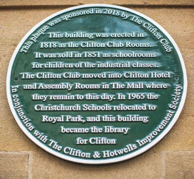 “This building was erected in 1818 as the Clifton Club Rooms. It was sold in 1851 as schoolrooms for children of the industrial classes. The Clifton Club moved into Clifton Hotel and Assembly Rooms in The Mall where they remain to this day. In 1965 the Christchurch Schools relocated to Royal Park, and this building became the library for Clifton.